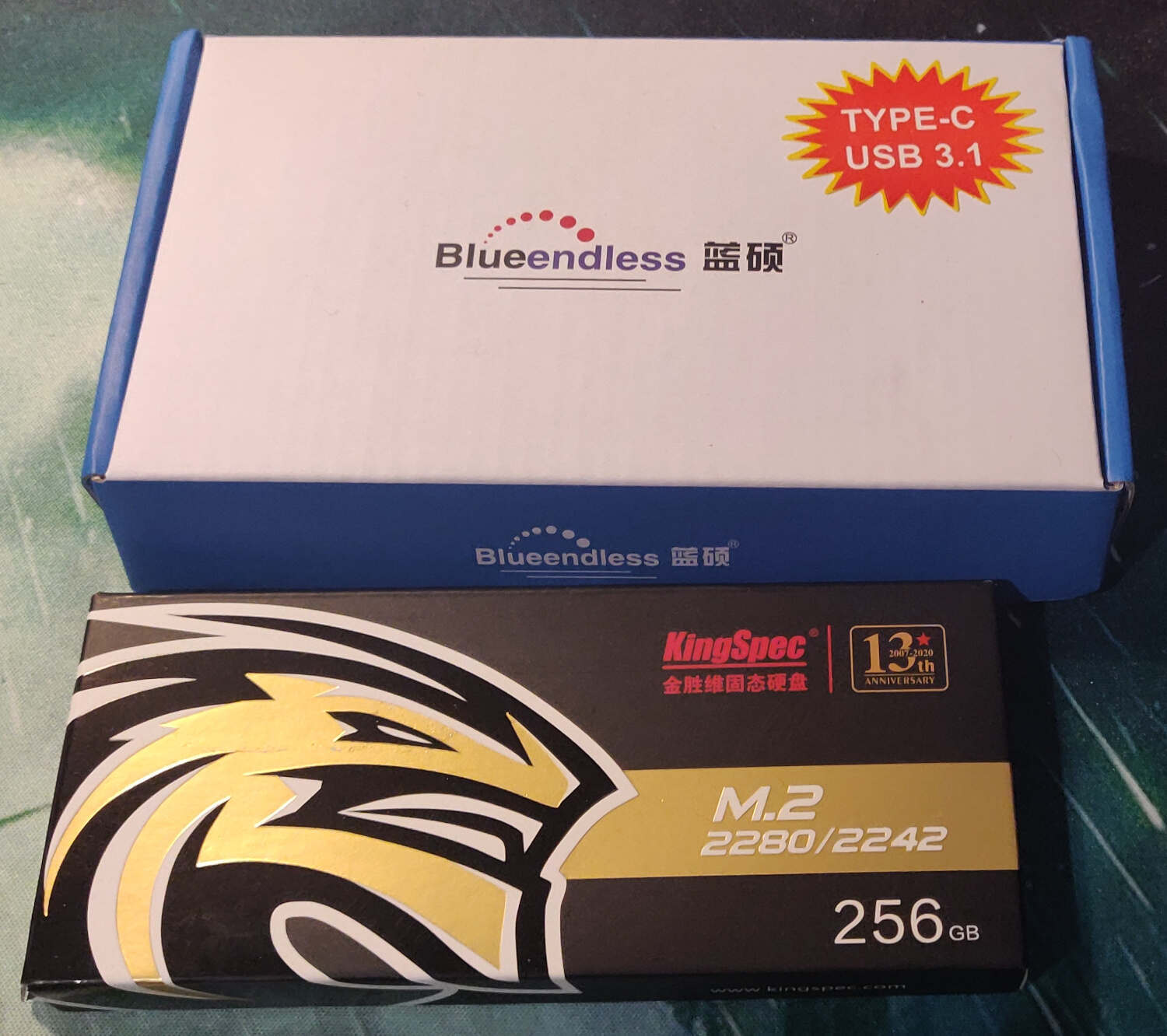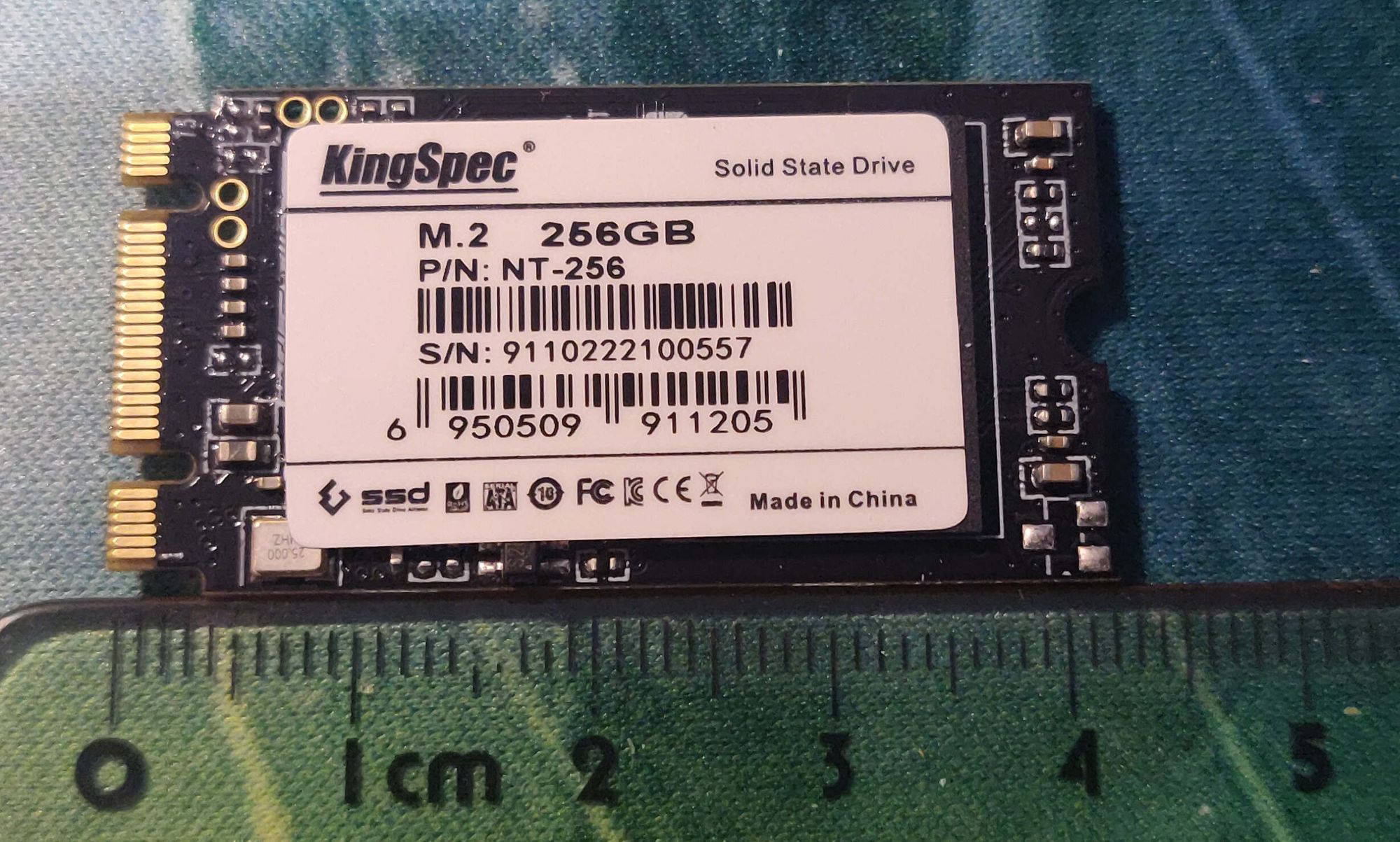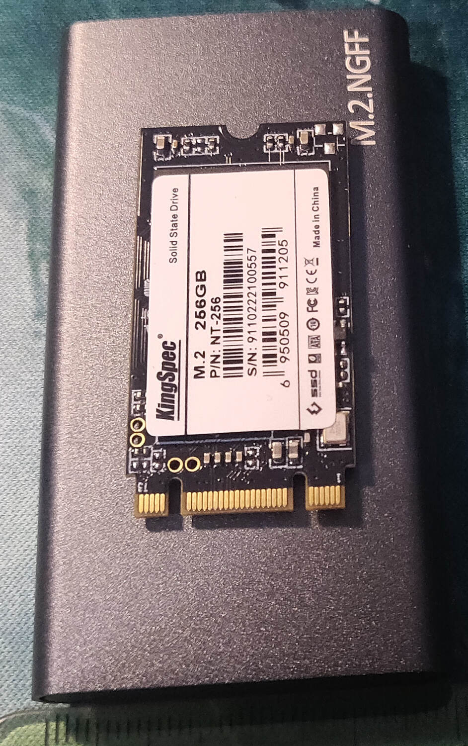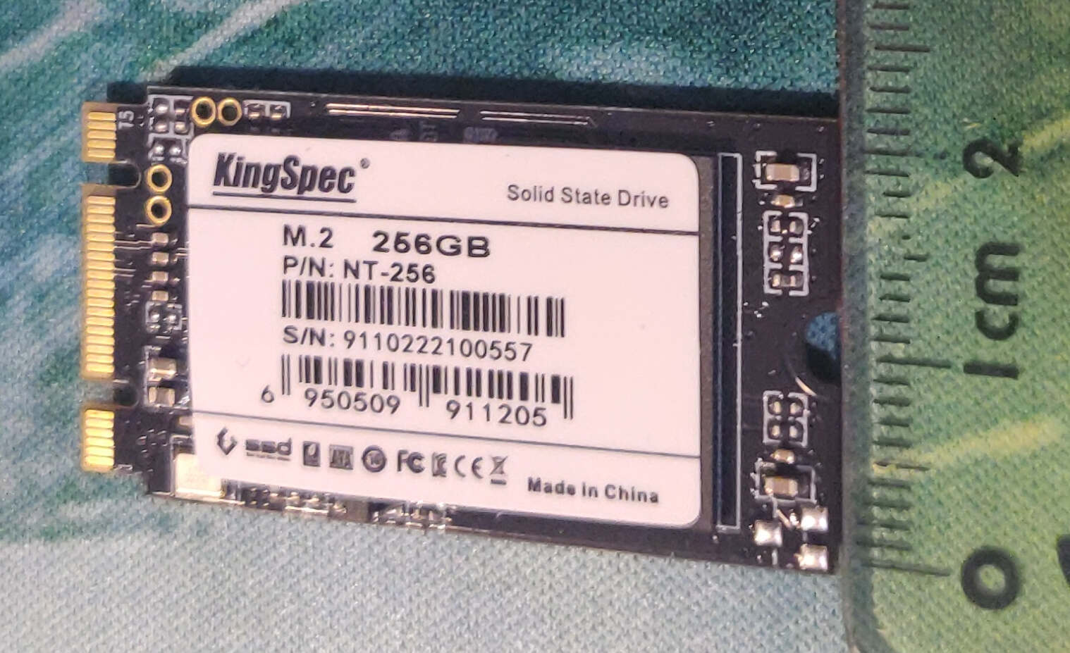 Le SSD est de marque KingSpec. Vous ne connaissez pas ? C'est normal, c'est une marque chinoise qui a fêté ses 13 ans en 2020 (j'ai découvert ça sur la boite du SSD) mais qui est distribué uniquement en Chine ou en import. En général les gens ont tendances à fuir ce genre de marque, mais j'avais déjà acheté au hasard un SSD de 32Go de cette marque autour de 2015 lors d'une promotion sur AliExpress pour moins de 10€. SSD que j'ai utilisé pendant 5 ans dans un de mes laptops sans problème particulier. J'ai pris ici un modèle M.2 2242 (2242 étant le format qui correspond à la taille physique du SSD 22x42mm, voir les photos plus bas) pour avoir quelque chose de très compact et théoriquement plus performant qu'un SSD Sata.