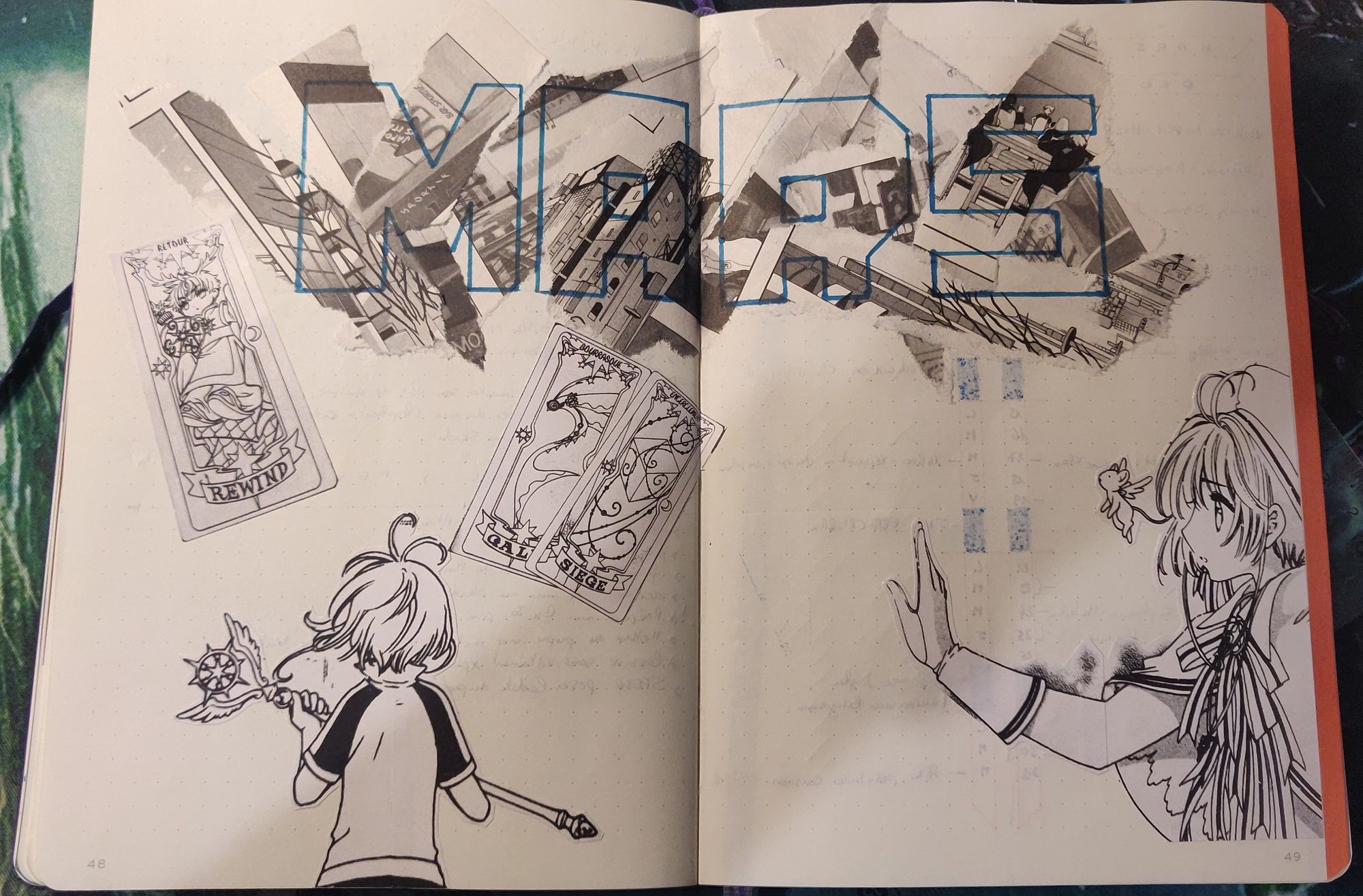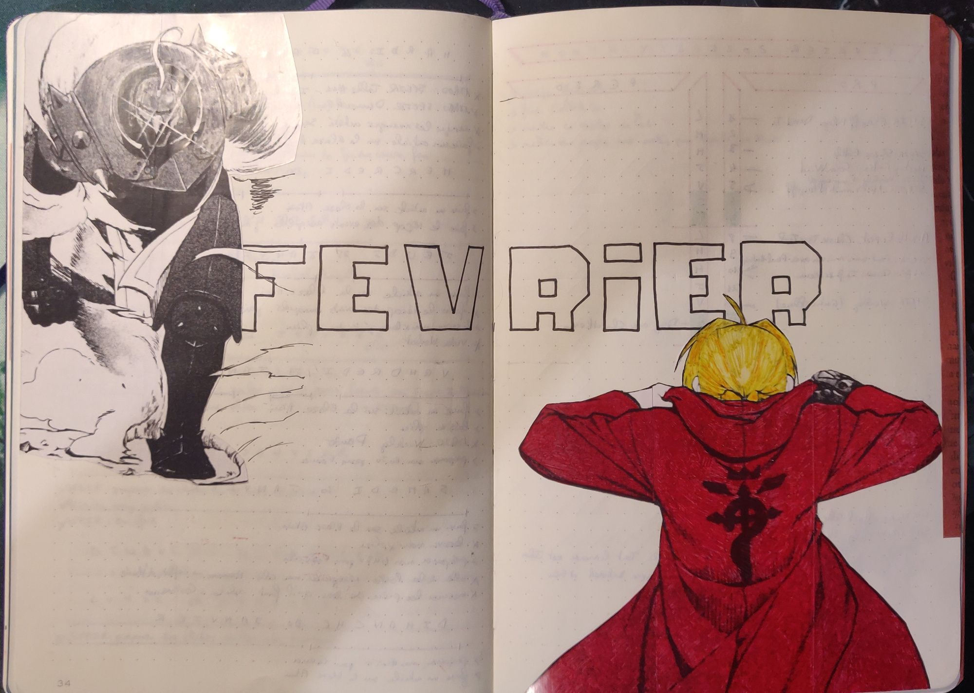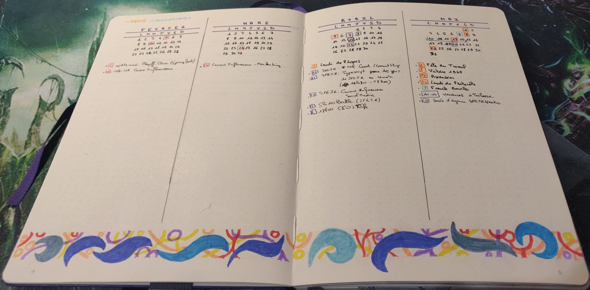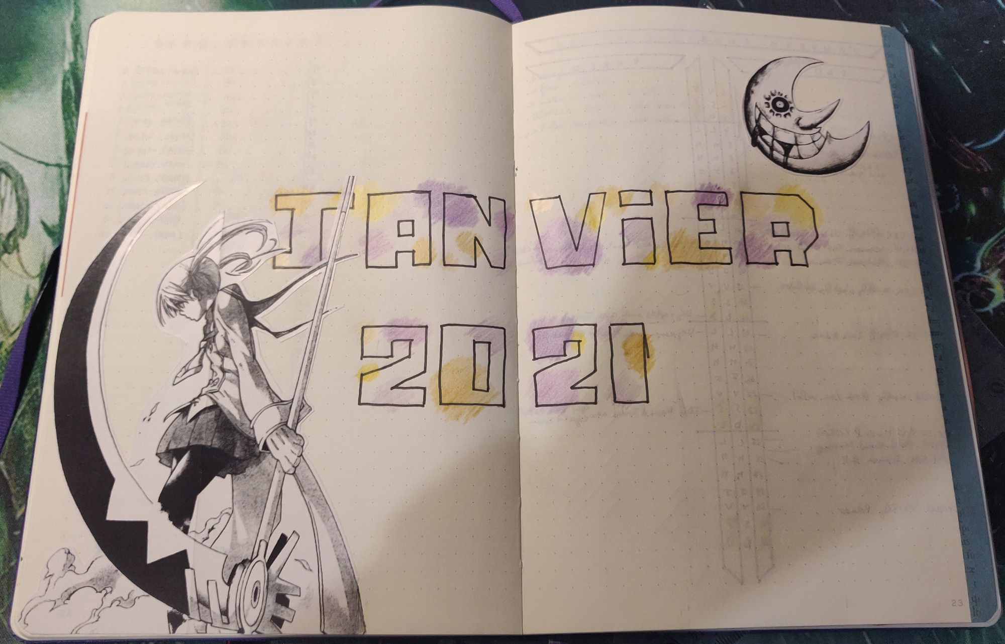 Ma double page de garde je viens souvent y coller de morceau de dessin, des stickers (souvent maison avec mon imprimante thermique), faire un test de motif sur le nom du mois, etc. J'ai mis 3 exemples plus bas. À noter la bande colorée sur le côté droit de ces pages (et qu'on retrouvera sur le côté gauche du calendrier mensuel) : j'ajoute une bande de masking tape sur la tranche de cette page pour très vite retrouver les débuts de mois des mois précédents.