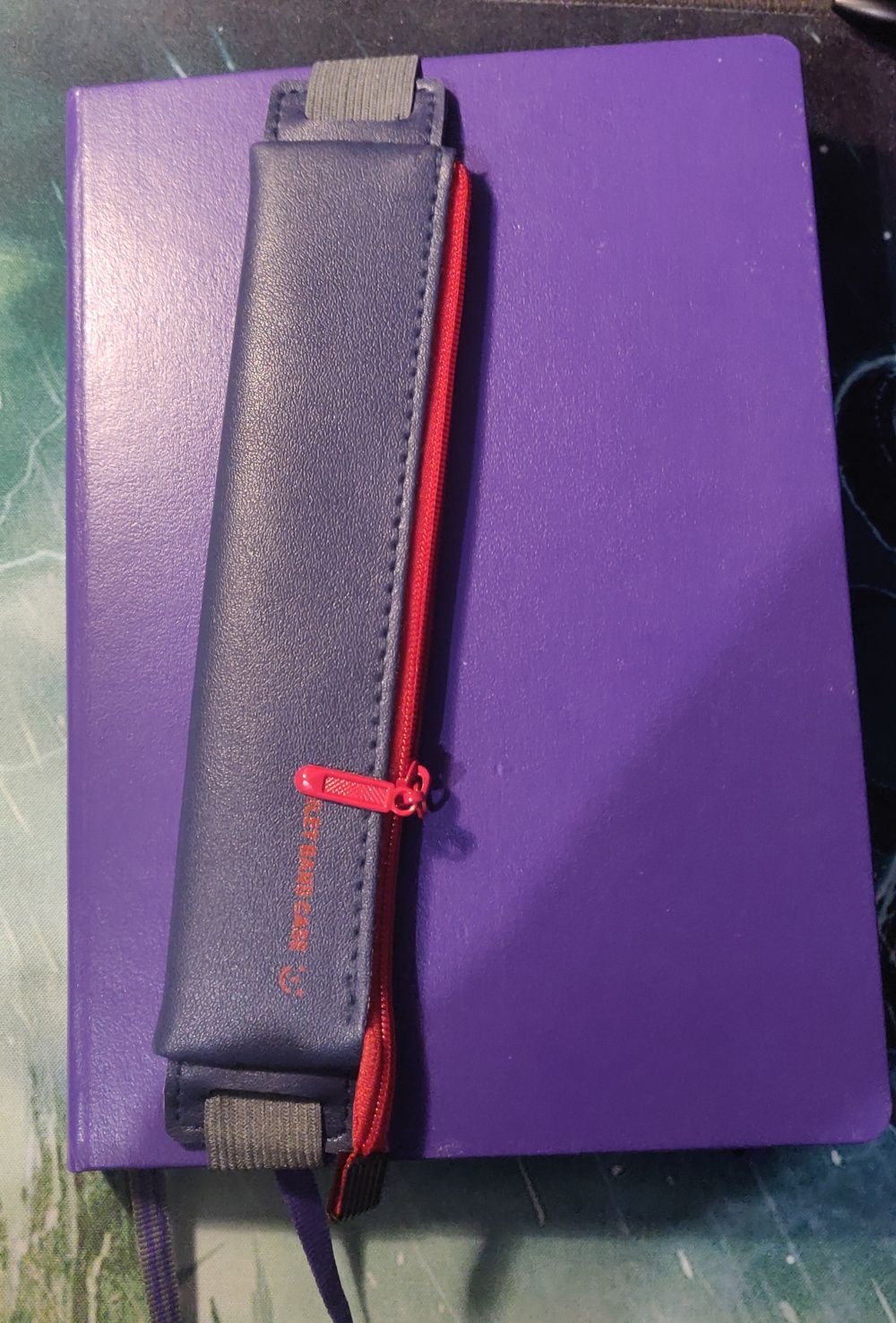 Depuis cette année, j'utilise une trousse à élastique pour ranger mon crayon avec mon carnet. Avant j'utilisais un élastique collé sur le carnet, mais je n'ai pas trouvé ça très pratique.