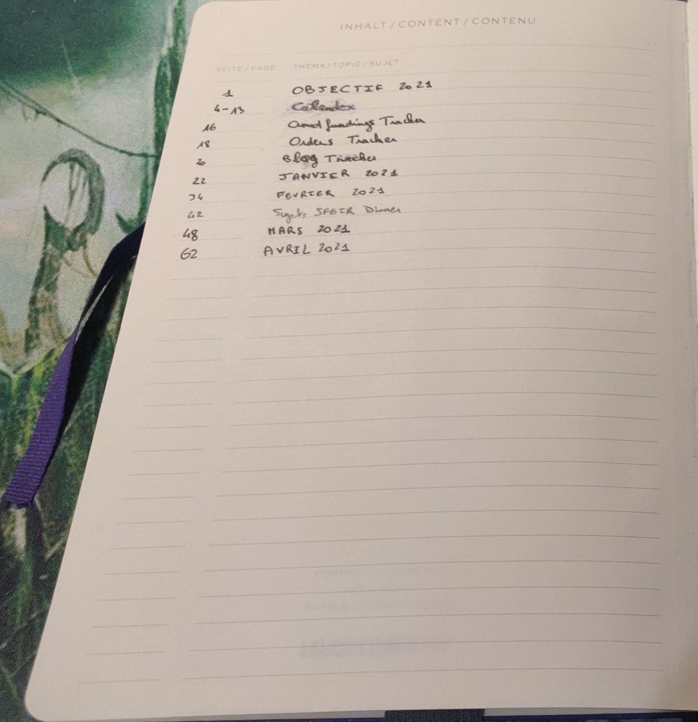 Les pages annuelles sont les pages qu'on consulte à priori le moins, mais ce n'est pas pour autant des pages inutiles ! Dans mon cas j'utilise : un index, une page d'objectif, un calendrier annuel, des pages de suivi de commande, une page de suivi pour ce blog.