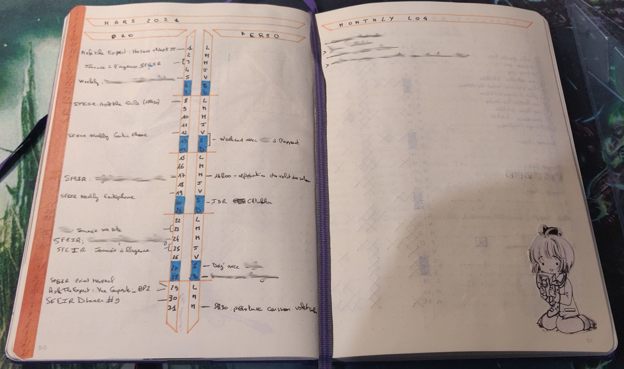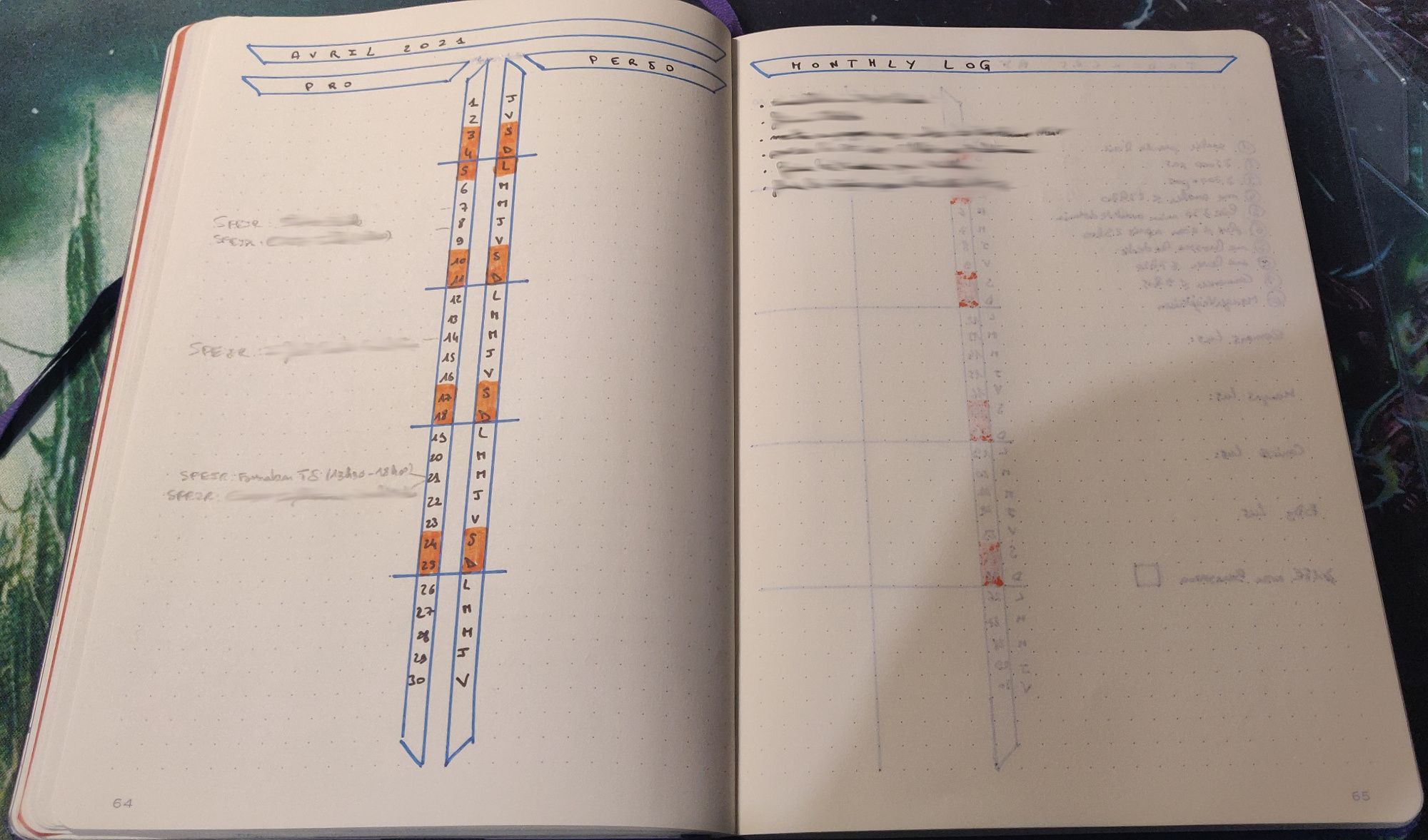 La partie calendrier du Monthly Log me permet d'avoir une vue complète sur le mois. J'ai placé la colonne des jours du mois au centre pour avoir d'un côté ce qui est professionnel et de l'autre ce qui est personnel. Cette séparation me permet de voir si ça se déséquilibre trop, et d'avoir directement du contexte sur ce que je note (côté pro et perso je n'aurai pas les mêmes personnes en face la plupart du temps). J'ai pris l'habitude de commencer par tout noter au crayon de bois, de sorte à pouvoir gommer les évènements annulés et une fois passé je re-note au crayon noir pour garder une trace des évènements. C'est très pratique d'avoir ce genre de vue, je peux très facilement retrouver à quels évènements j'ai participé et quand, que ce soit une soirée entre potes, un rendez-vous chez le médecin, un meetup ou une réunion avec mon Team Leader.
