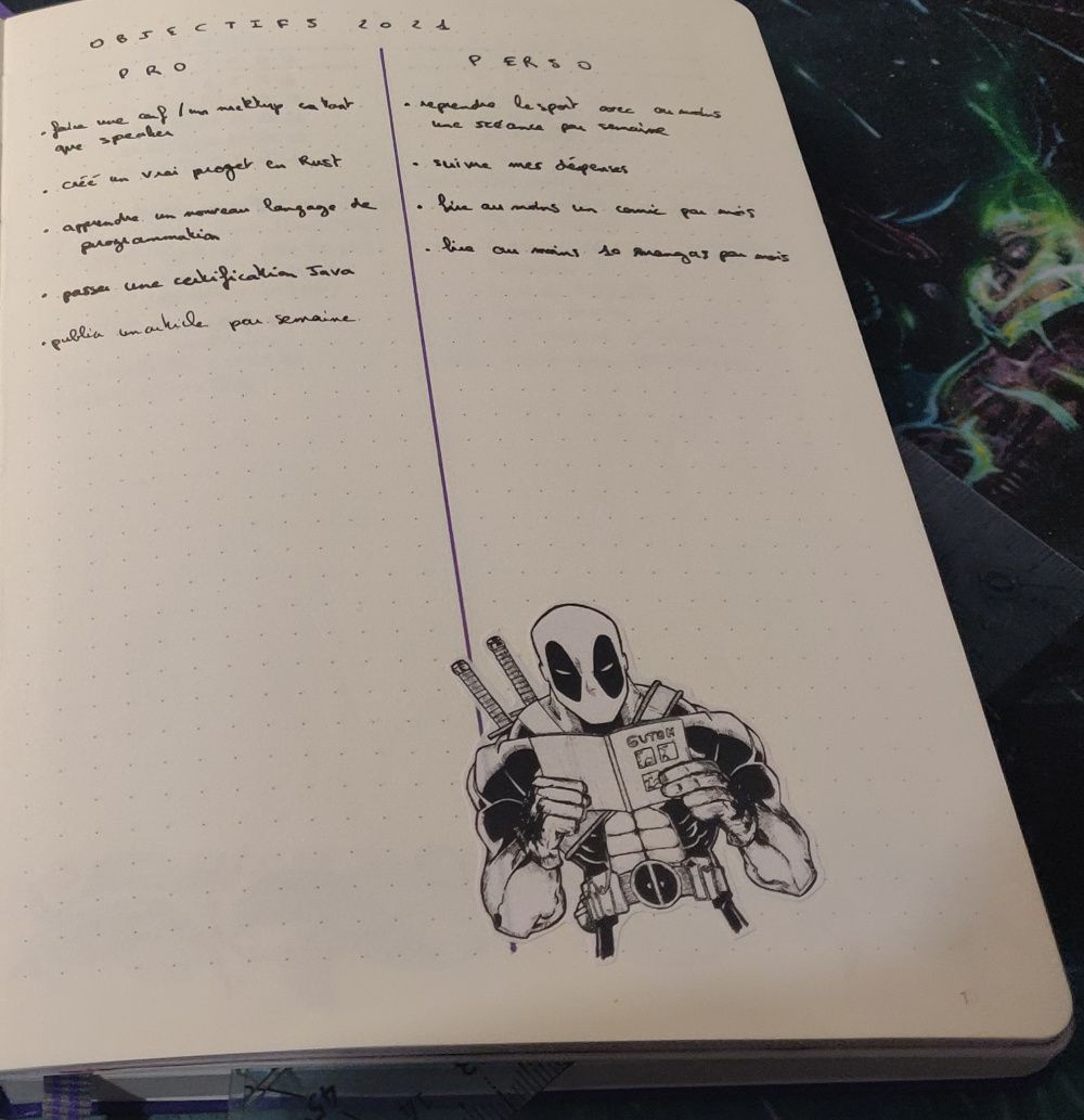Une page d'objectif qui me sert à définir les grands axes à travailler dans l'année. Ce n'est pas forcément des choses contraignantes qu'il faut noter : j'ai typiquement un objectif de lecture de 10 mangas par mois minimum, je n'ai normalement pas de problème à le faire (j'en lis facilement 20-30 par mois) mais c'est un contrat avec moi-même de vraiment m'y tenir.