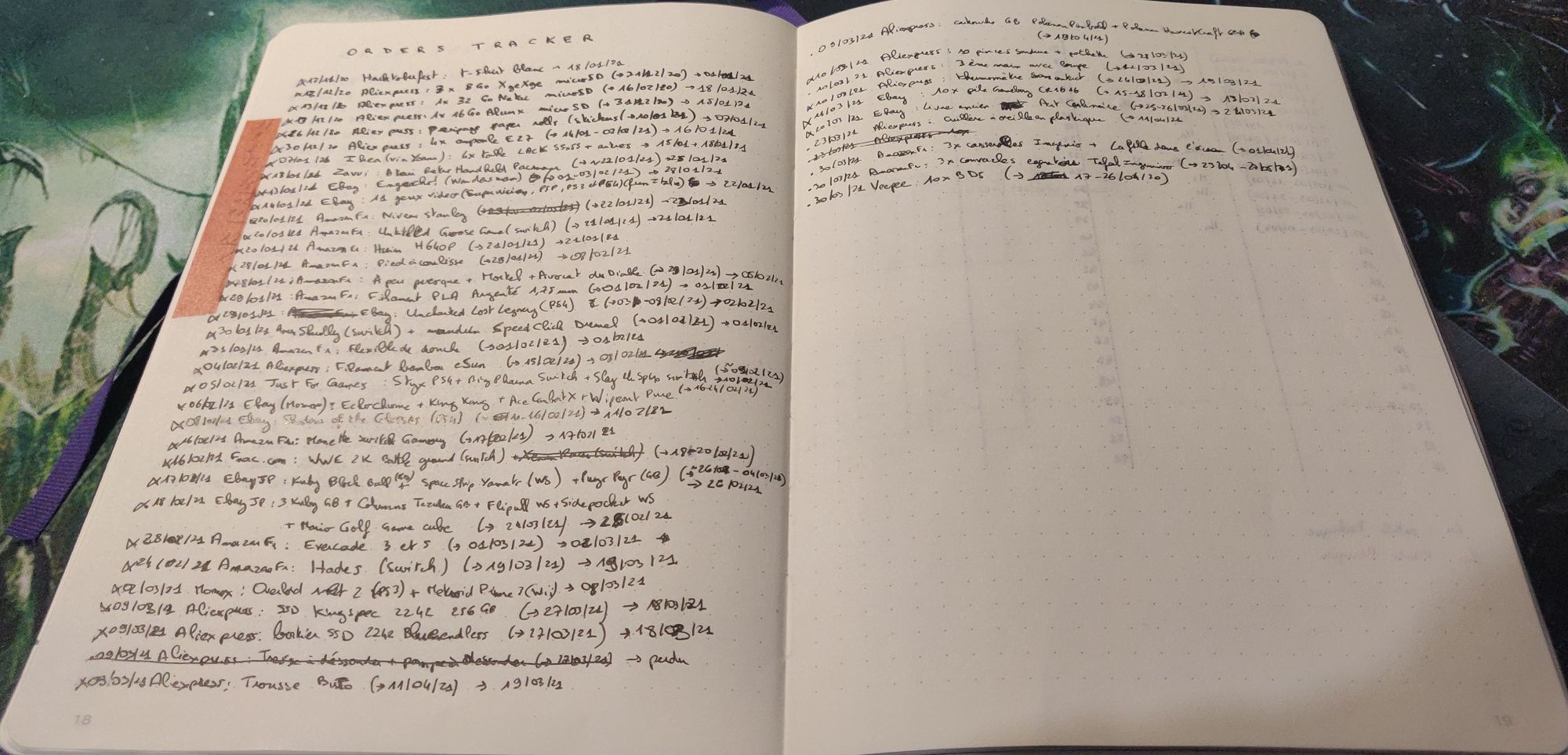 Des pages de traqueurs de commande. Je fais beaucoup de commande en ligne, j'achète beaucoup de petite chose ou des objets d'occasion (par exemple sur Ebay pour les jeux-vidéos retro) et j'ai besoin de suivre où j'en suis. C'est très pratique cette double page, je peux suivre facilement les commandes que j'attends, parfois pour relancer les vendeurs ou jeter un coup d'œil au suivi. J'ai aussi une double page pour les crowdfounding (Kickstarter et Ulule), car c'est finalement des commandes qui arriveront plusieurs mois voir années plus tard, avec une temporalité si longue difficile de se rappeler de tout surtout quand comme moi on a facilement 25 crowdfoundings en attente de réception.