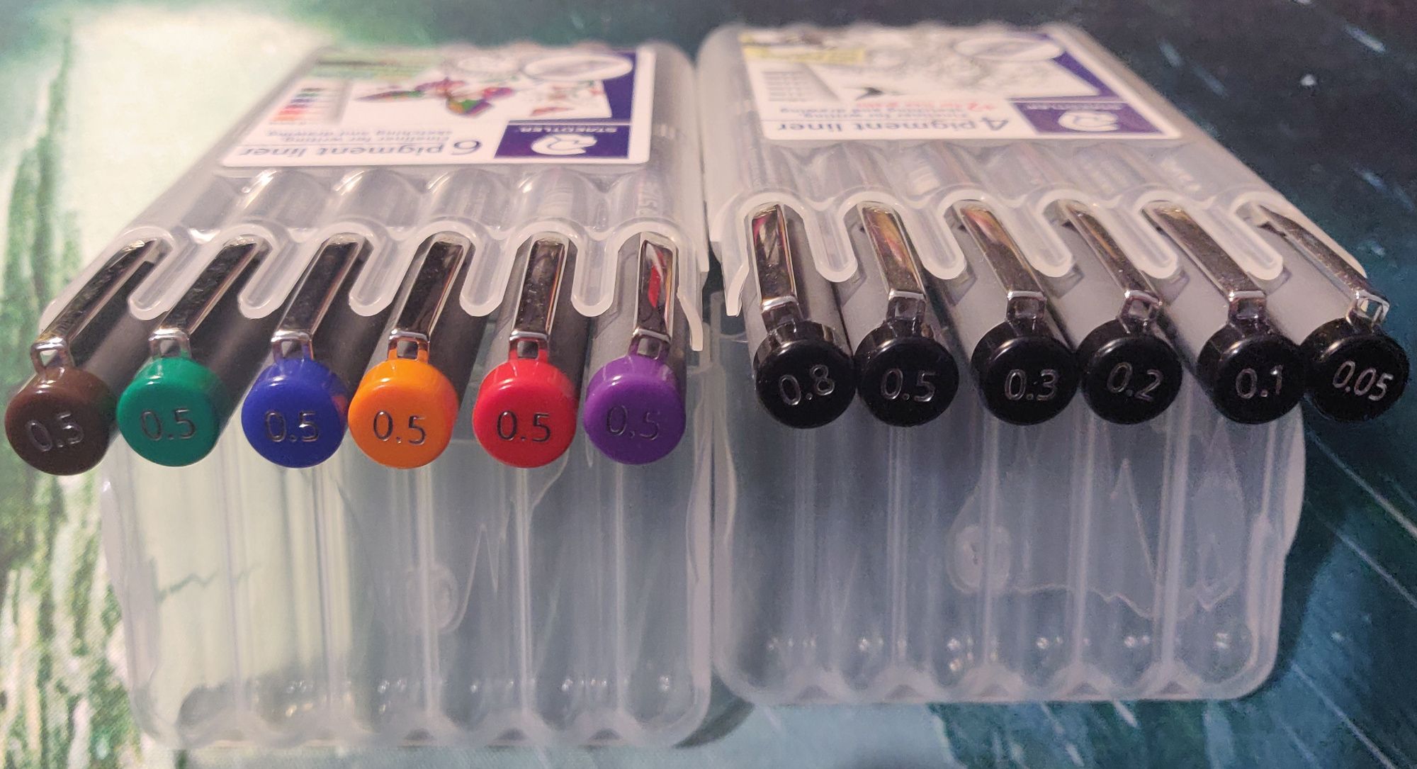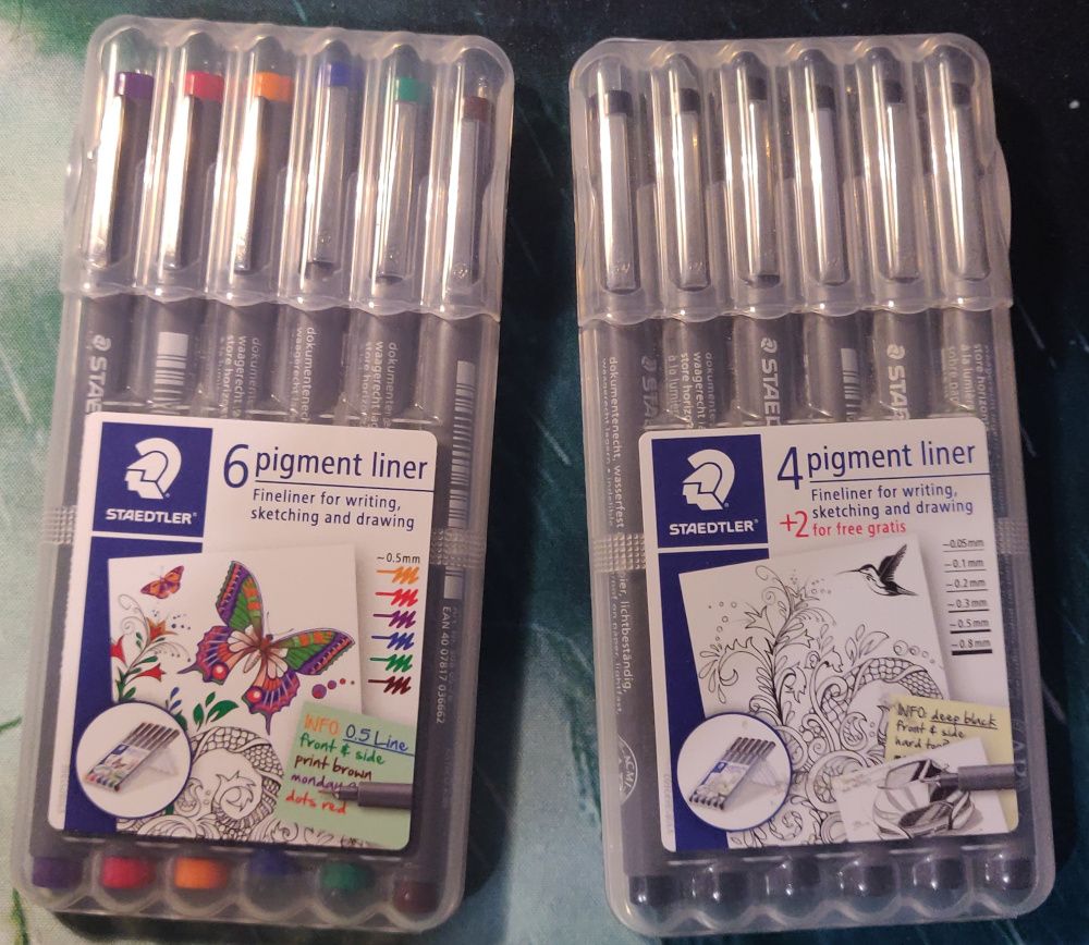 J'ai deux lots de crayons pointe fine de chez Staedtler : un lot 6 couleurs en 0.5mm, et un lot noir allant de 0.05 à 0.8mm. C'est les crayons que j'utilise vraiment le plus, ils sont très agréables à utiliser, ne sont pas très chers, ils sont très durables.
