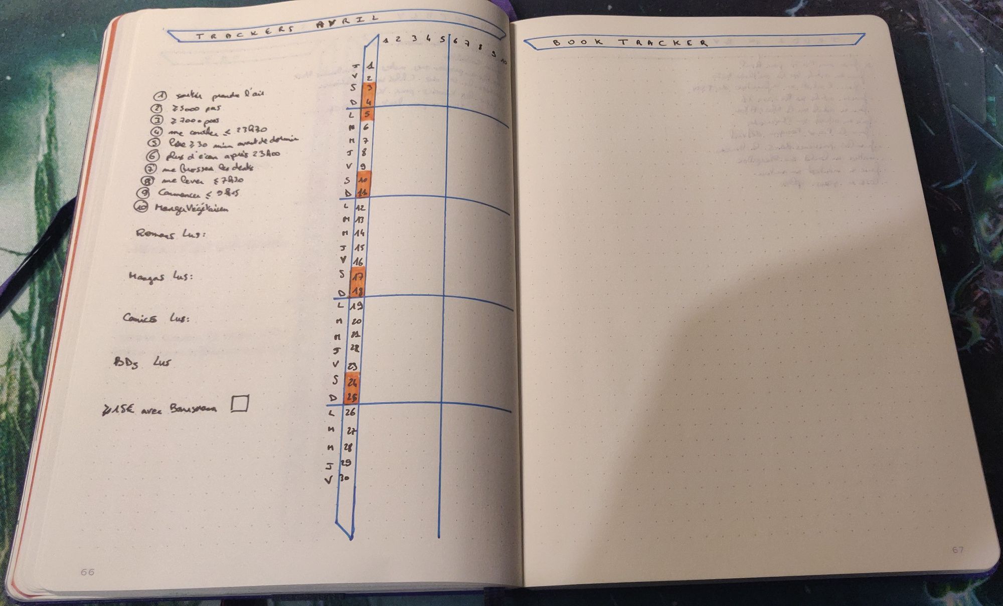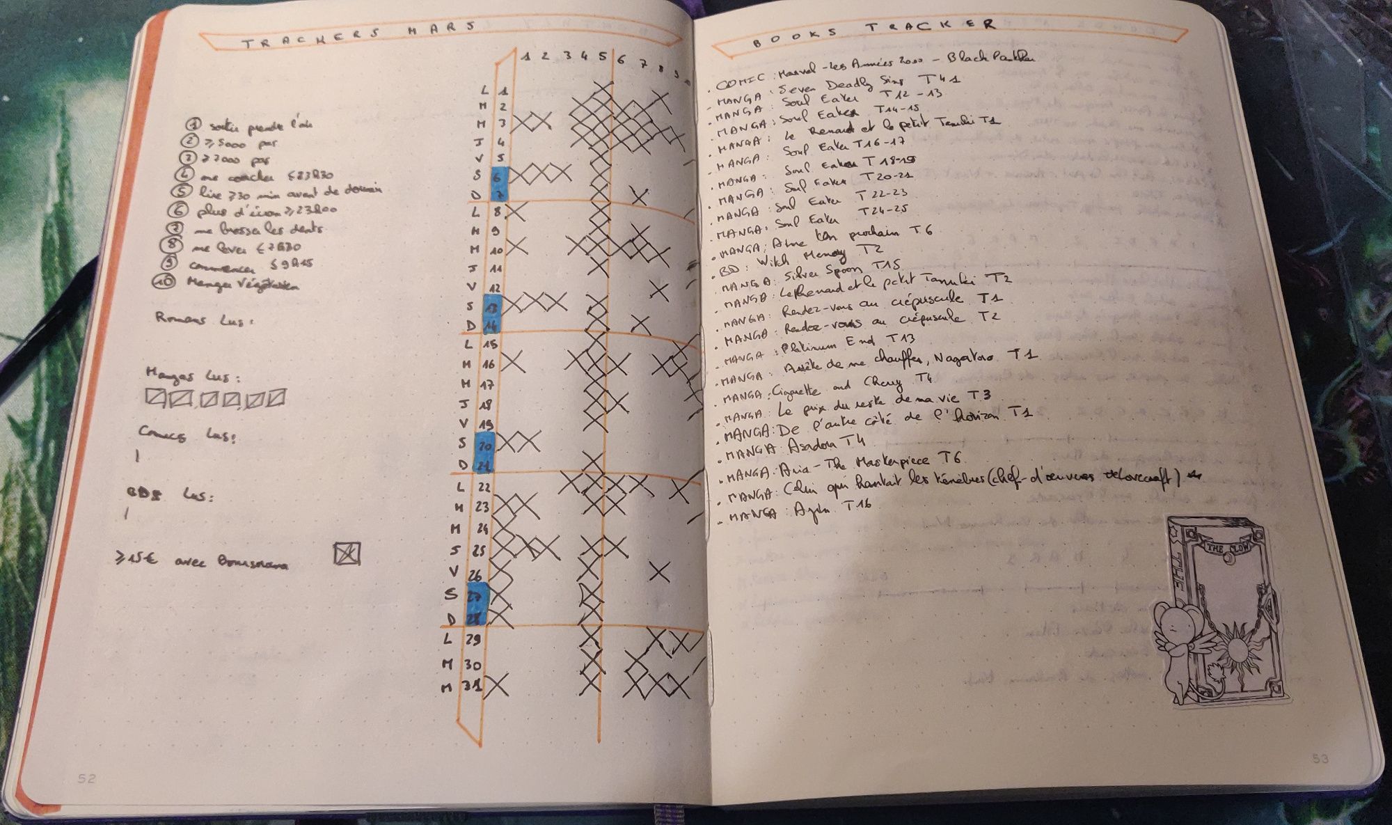 J'ai une double page pour les traqueurs. La page de gauche va regrouper tous les traqueurs sauf un en particulier. J'ai regroupé 3 types de traqueurs ici : des traqueurs de vie quotidienne (le tableau avec les croix), des traqueurs de quantité et un traqueur unique.