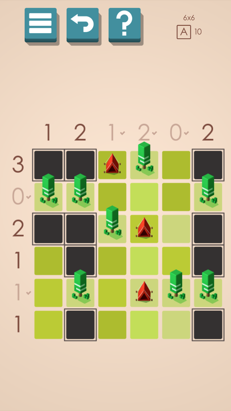 Mais ce qui diffère c'est qu'on ne cherche à pas produire un dessin mais juste placer des éléments en se basant sur des règles de placement (ce qui n'existe pas dans les nonograms) : un arbre doit avoir une tente accolée horizontalement ou verticalement, une tente ne peut pas avoir une autre tente comme voisin directement verticalement, horizontalement ou en diagonale.